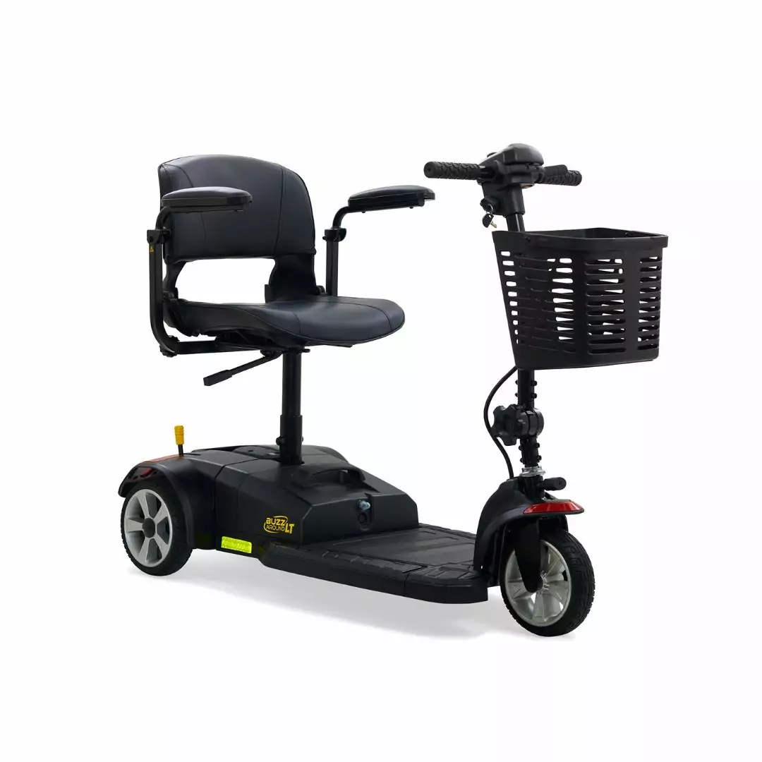 The all-new Buzzaround LT scooter is the smallest, lightest, and most portable Buzzaround scooter to get you were you want to go in comfort and style! Offered in both 3-wheel and 4-wheel models, this sporty design features a lightweight, stadium style seat, a weight capacity of 300 lbs., and increased foot room. The new Buzz LT also has a charger port in the tiller, a new hard plastic rugged basket, and color through shrouds. Enjoy its tight indoor maneuverability and smooth outdoor ride with 2.5″ of ground clearance!